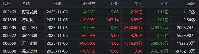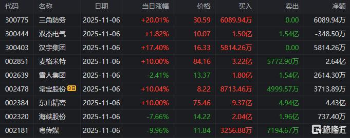 中山东路:净买入三角防务1.621亿元、万向钱潮7051万元、福马龙6498万元,净卖出漳州发展5577万元