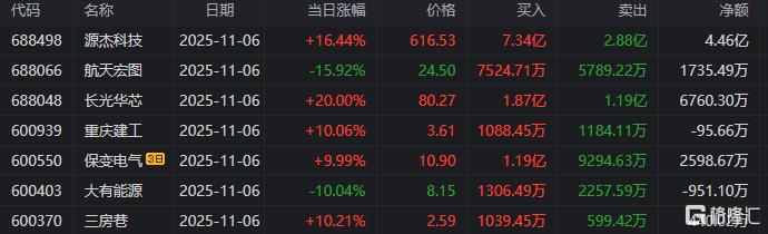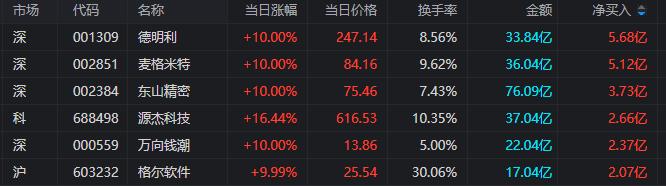 龙虎榜单日净买入额前三为德明利、麦格米特、东山精密,分别为5.68亿元、5.12亿元、3.73亿元。