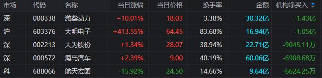 龙虎榜中涉及机构专用席位的个股中,当日净卖出额前三为潍柴动力、大明电子、大为股份,分别为1.43亿元、1.05亿元、9045.11万元。
