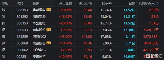 龙虎榜中涉及机构专用席位的个股中,当日净买入额前三为海科新源、华盛锂电、中能电气,分别为1.76亿元、1.51亿元、4213.20万元。