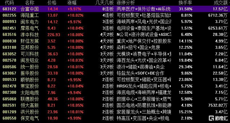 焦点股方面,合富中国放量涨停走出8连板,参与钍基熔盐实验堆的海陆重工一字涨停晋级4连板,铬盐龙头振华股份7天4板,电网设备叠加AMC概念的摩恩电气3连板。