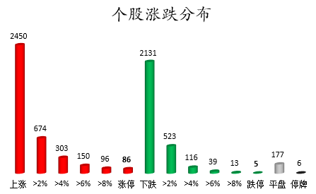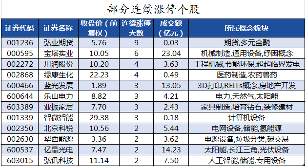 截至收盘,沪深两市合计2450只个股上涨,2131只个股下跌,平盘个股177只,停牌的个股6只。不含当日上市新股,共有86只个股涨停,5只个股跌停。连续涨停天数看,弘业期货已连收9个涨停板,连续涨停板数量最多。