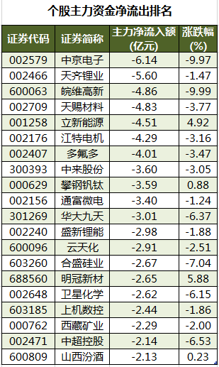 此外,2905只个股被主力资金净卖出,其中,69股被主力资金净卖出超1亿元。主力资金净流出最多的个股是中京电子,净流出金额为6.14亿元;主力资金净流出居前的个股还有天齐锂业、皖维高新、天赐材料、立新能源、江特电机,净流出金额分别为5.6亿元、4.86亿元、4.83亿元、4.51亿元、4.29亿元。