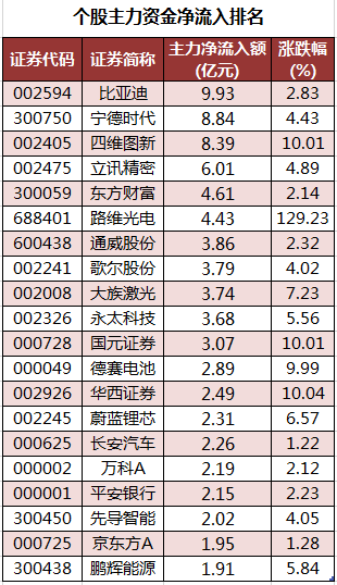 个股来看,今日有1846只个股获主力资金净流入,其中,50股获主力资金净流入超1亿元。比亚迪获主力资金净流入最多,净流入金额为9.93亿元;主力资金净流入居前的个股还有宁德时代、四维图新、立讯精密、东方财富、路维光电,净流入金额分别为8.84亿元、8.39亿元、6.01亿元、4.61亿元、4.43亿元。