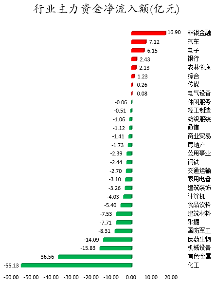 从行业板块来看,申万所属的28个一级行业,今日有8个行业板块主力资金呈现净流入,其中,非银金融行业板块主力资金净流入最多,净流入金额为16.9亿元;行业板块主力资金净流入居前的还有汽车、电子、银行,净流入金额分别为7.12亿元、6.15亿元、2.43亿元。20个行业板块主力资金呈现净流出,其中,化工行业板块主力资金净流出最多,净流出金额为55.13亿元;行业板块主力资金净流出靠前的还有有色金属、机械设备、医药生物、国防军工、采掘,净流出金额分别为36.56亿元、15.83亿元、14.09亿元、8.31亿元、7.71亿元。