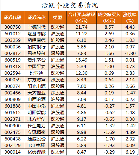 活跃个股方面,北向资金净买入较多的有宁德时代、隆基绿能、药明康德、招商银行、恩捷股份,净买入金额分别为8.57亿元、2.69亿元、2.46亿元、2.1亿元、1.66亿元。北向资金净卖出的较多有亿纬锂能、TCL中环、通威股份、立讯精密、长江电力,净卖出金额分别为3.29亿元、1.93亿元、1.7亿元、1.69亿元、1.32亿元。