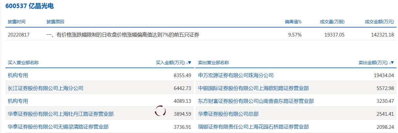 亿晶光电今天涨停。盘后数据显示,2个机构出现在龙虎榜单上,合计净买入1.24亿元;长江证券股份有限公司上海分公司买入6442.73万元;华泰证券股份有限公司上海牡丹江路证券营业部买入3894.59万元;申万宏源证券有限公司珠海分公司卖出1.94亿元;中银国际证券股份有限公司上海欧阳路证券营业部卖出5572.98万元。