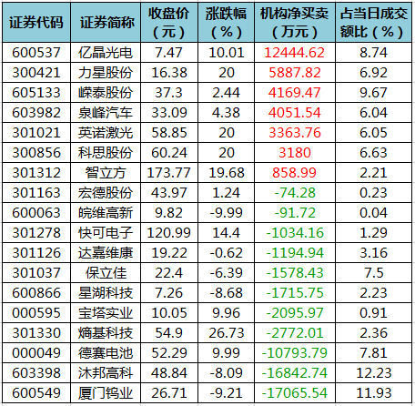 盘后龙虎榜数据显示,今日机构席位资金合计净卖出约2.13亿元。其中,净买入的个股7只,净卖出的个股11只。机构净买入最多的股票是亿晶光电,净买入金额约1.24亿元;机构净买入居前的还有力星股份、嵘泰股份等股。机构净卖出最多的股票是厦门钨业,净卖出金额约1.71亿元。机构净卖出靠前的还有沐邦高科、德赛电池、熵基科技等股。