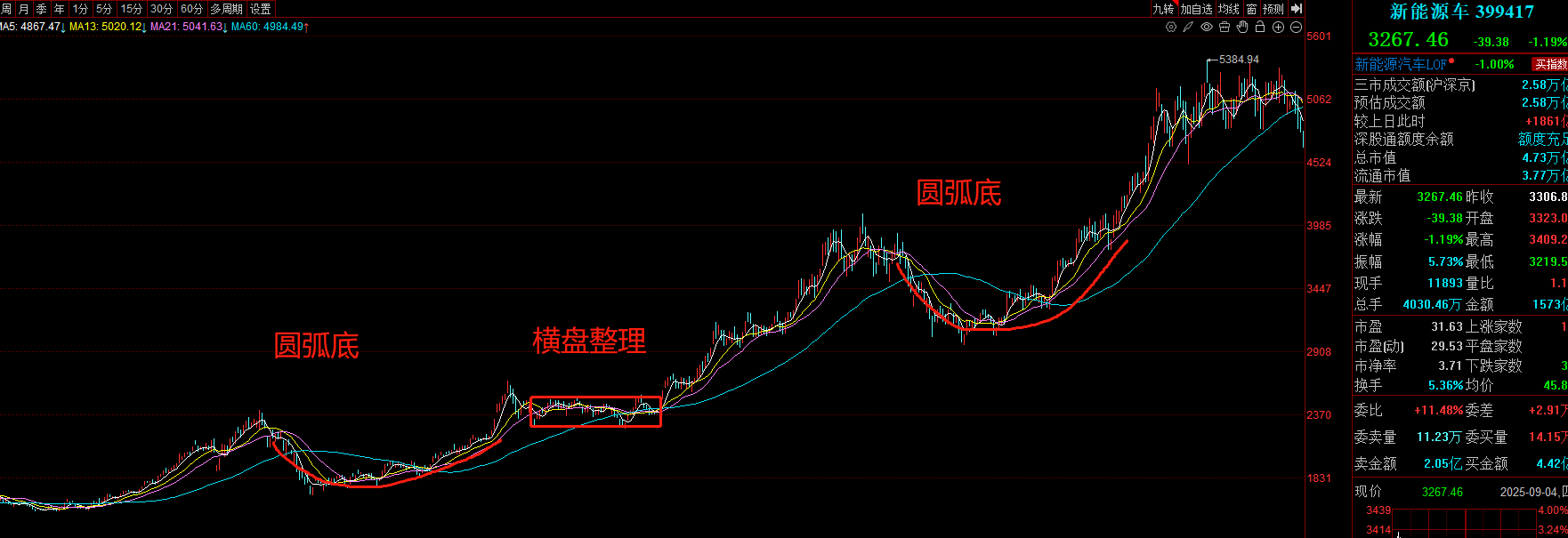 当时新能源汽车指数,第一次圆弧底指数回调了23%,21个交易日才见底,第二次横盘整理跌了13%,横盘57个交易日才启动,第二次圆弧底跌了25%,跌了26个交易日见底。