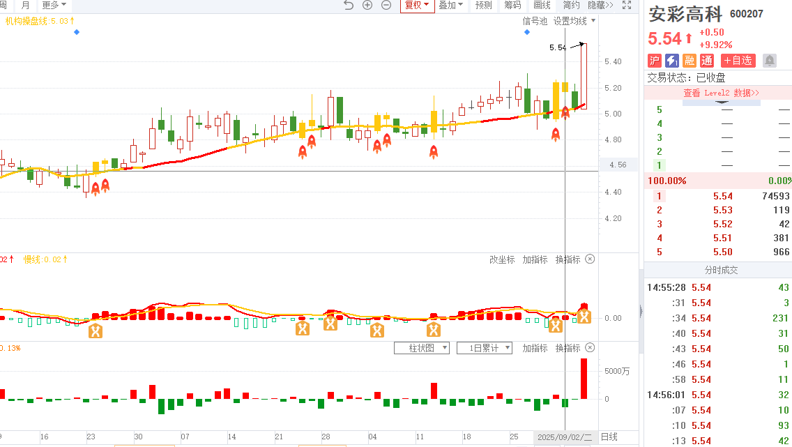 2)20250902-安彩高科-四维操盘-近期出现火箭信号且底部量柱由绿转红