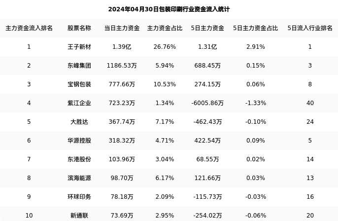 从主力资金流向来看,包装印刷行业今日主力资金流入11.30亿元,在所有申万二级行业中排名:5/131。