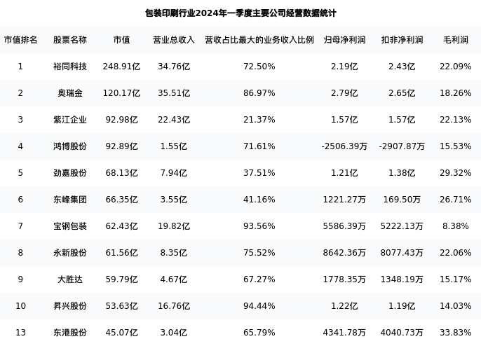 东港股份最新报告期数据为一季度,下表汇总了包装印刷行业内市值靠前的公司一季度主要经营数据