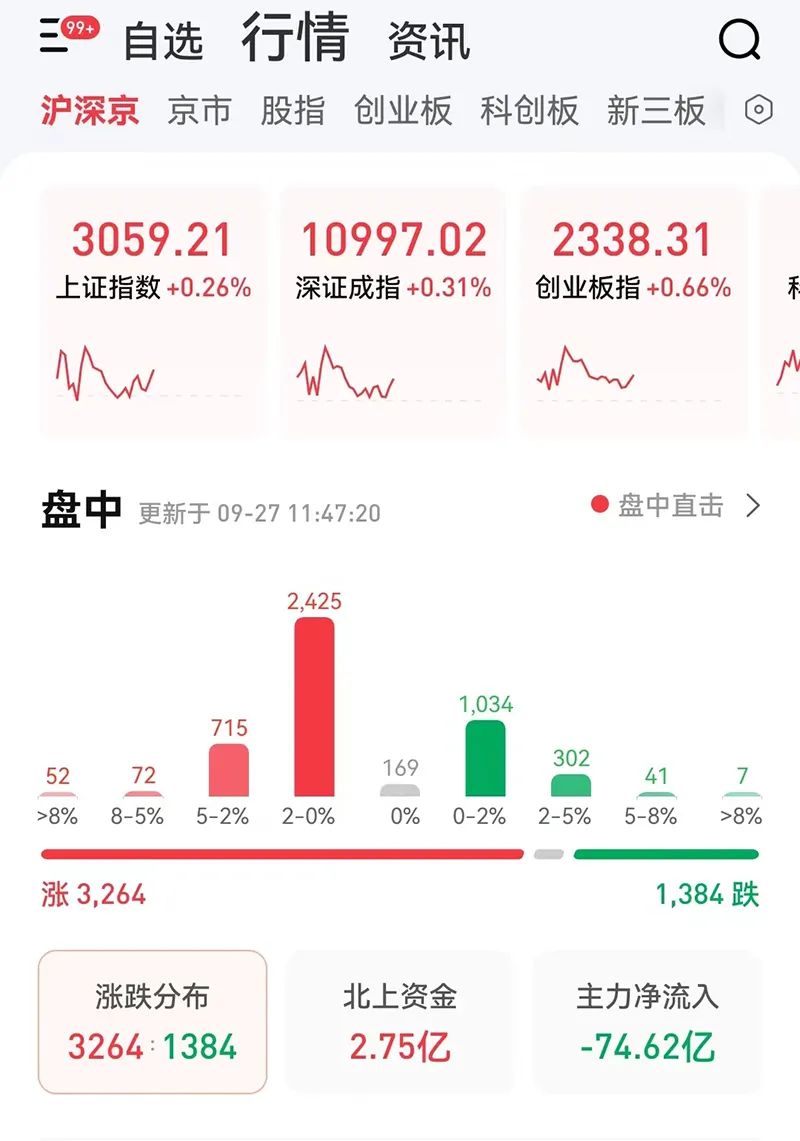 今日早盘,A股市场整体呈现反弹态势。继昨日新能源股票集体反扑后,今日医药与半导体板块接棒复苏,带动创业板指继续领涨。外资情绪稍显犹豫,早盘小幅净买入2.75亿元,主要集中在沪股通一侧。