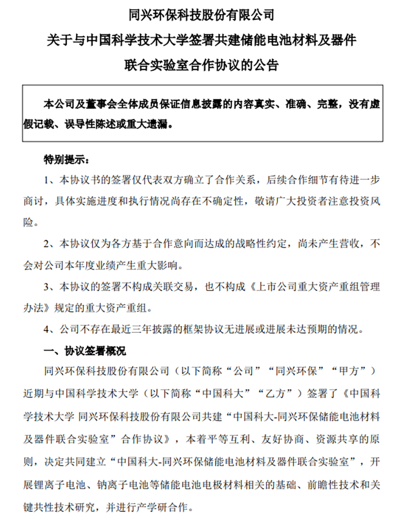 9月17日,同兴环保披露《关于与中国科学技术大学签署共建储能电池材料及器件联合实验室合作协议的公告》。公告称:公司近期与中国科学技术大学签署了合作协议,决定共同建立“中国科大-同兴环保储能电池材料及器件联合实验室”,开展锂离子电池、钠离子电池等储能电池电极材料相关的基础、前瞻性技术和关键共性技术研究,并进行产学研合作。