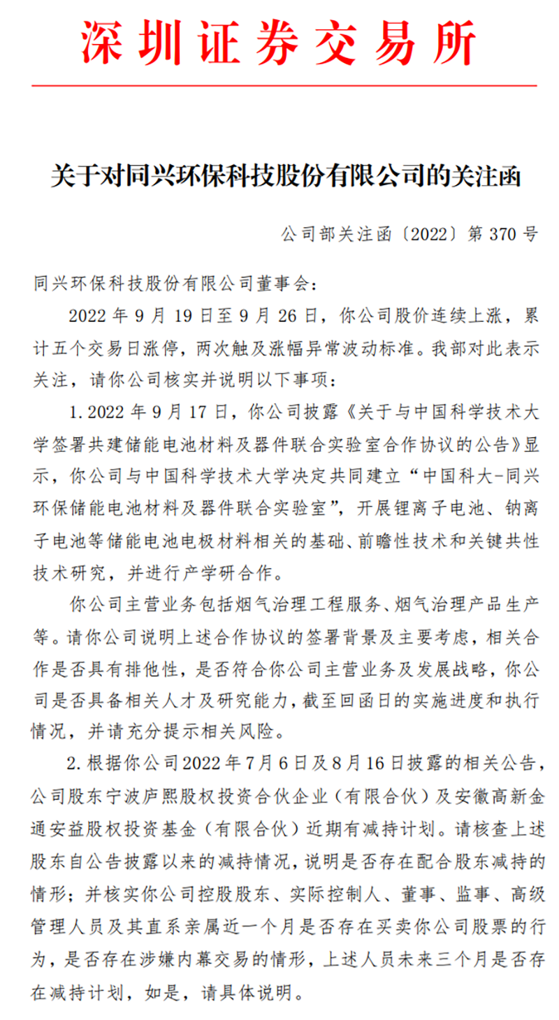 对此,9月26日,深交所向同兴环保递送关注函,要求公司说明与中国科大合作协议的签署背景及主要考虑,相关合作是否具有排他性,是否符合公司主营业务及发展战略,公司是否具备相关人才及研究能力,以及截至回函日的实施进度和执行。