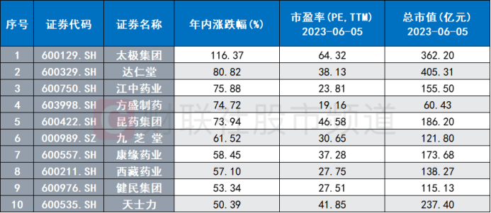 注:年内涨幅居前的中药股(截至6月5日收盘)
