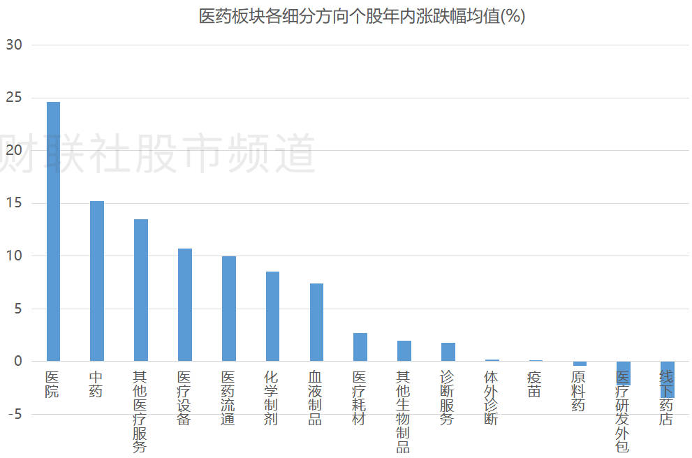 今年以来,医药赛道中的部分细分方向已逐步回暖,截至今日收盘,医院板块个股年内平均上涨近24%,位居各细分方向首位,中药、其他医疗服务、医疗设备方向个股年内涨幅均值也均在10%以上。此外,医药流通、化学制剂、血液制品等股方向也涨幅居前,而线下药店、医疗研发外包、原料药3个板块个股年内涨跌幅均值则显示收跌。