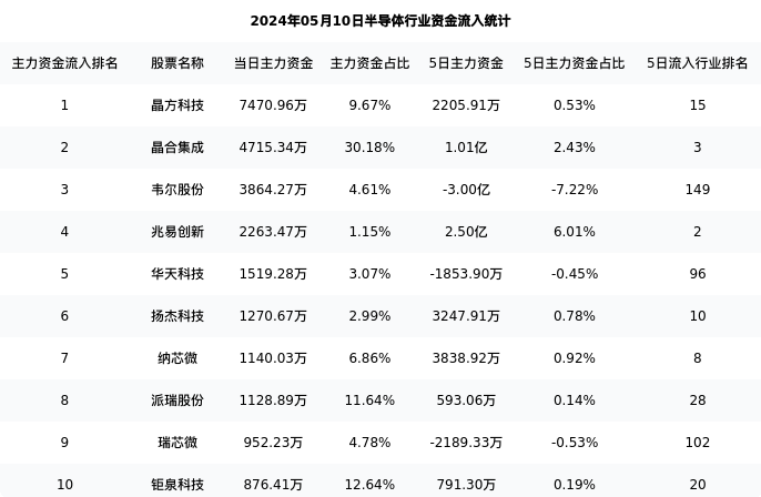下表为今日行业内流入前10股票的信息