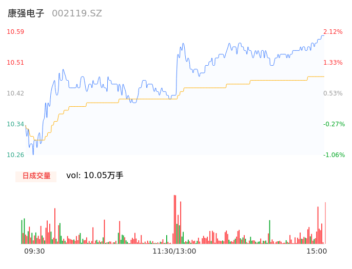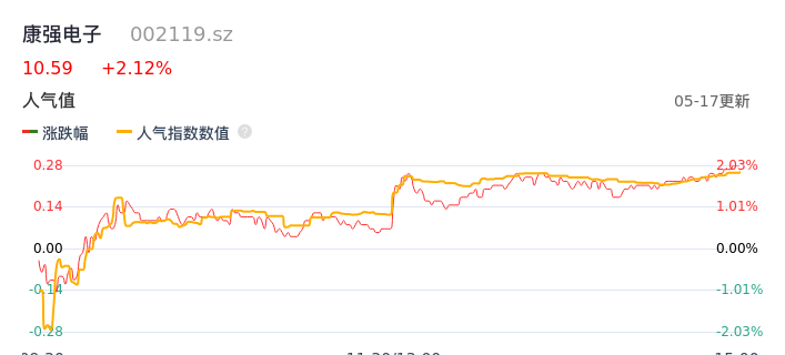 05月17日,康强电子收报10.59,股价涨幅2.12%,成交金额1.05亿元,换手率2.68%。
