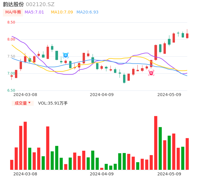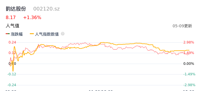 05月09日,韵达股份收报8.17,股价涨幅1.36%,成交金额2.95亿元,换手率1.28%。