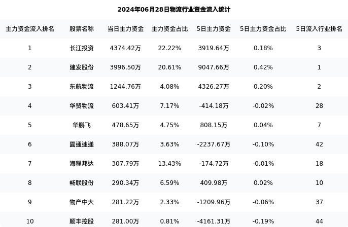 从主力资金流向来看,物流行业今日主力资金流入6.94亿,在所有申万二级行业中排名:106/131。