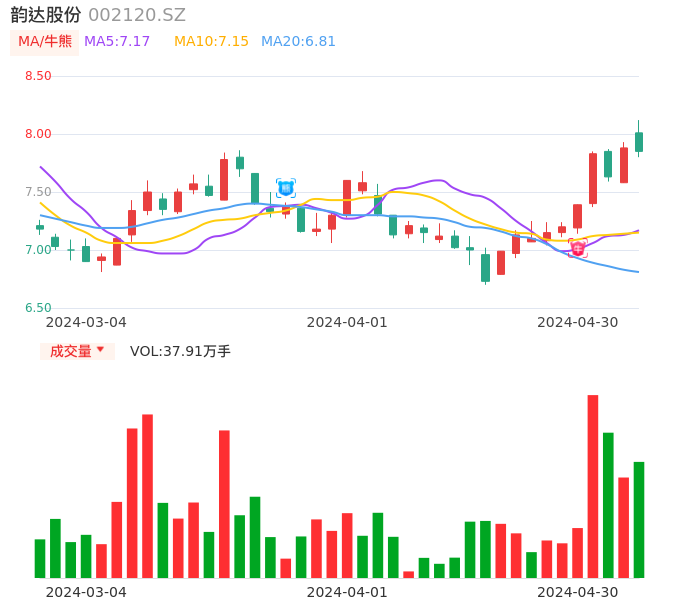 04月30日,韵达股份收报7.85,股价涨幅-0.38%,成交金额3.00亿元,换手率1.35%。
