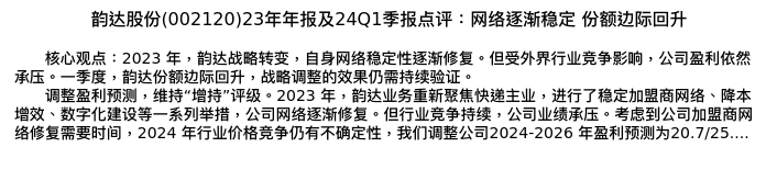 值得注意的是:2024年05月中泰证券的郑澄怀/王旭晖分析师,首次发布关于韵达股份的研究报告,标题为:韵达股份(002120)23年年报及24Q1季报点评:网络逐渐稳定 份额边际回升。