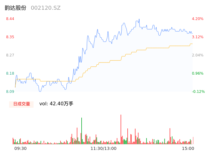 05月14日,韵达股份收报8.37,股价涨幅3.33%,成交金额3.53亿元,换手率1.51%。