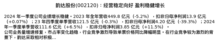 值得注意的是:2024年04月国信证券的罗丹/高晟分析师,首次发布关于韵达股份的研究报告,标题为:韵达股份(002120):经营稳定向好 盈利稳健增长。