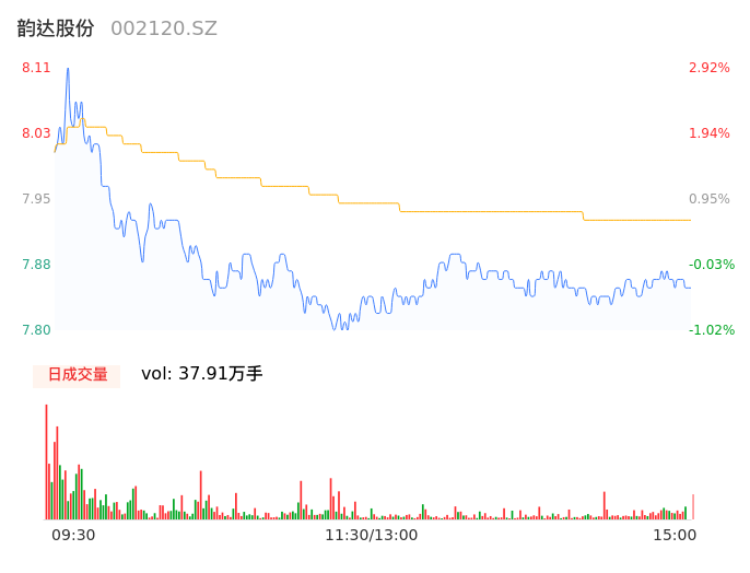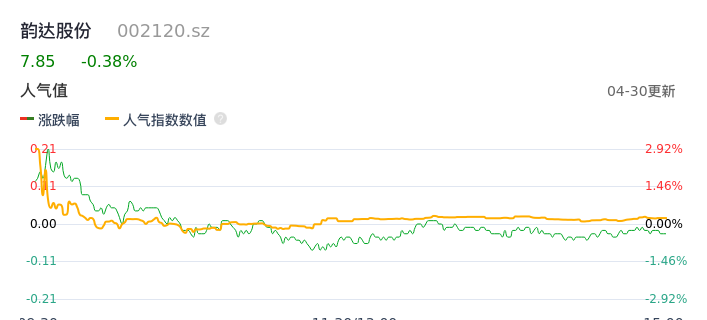 04月30日,韵达股份收报7.85,股价涨幅-0.38%,成交金额3.00亿元,换手率1.35%。