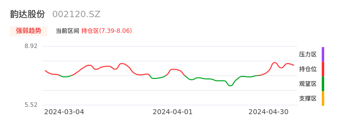我们来看一下该股的九方特色指标强弱趋势的情况:韵达股份自04月23日从观望区上穿到持仓区。股价近期在多头区域回调整理。后续重点关注多空分界点的争夺:7.39元。如未能有效站稳则可能重新回到空头行情。
