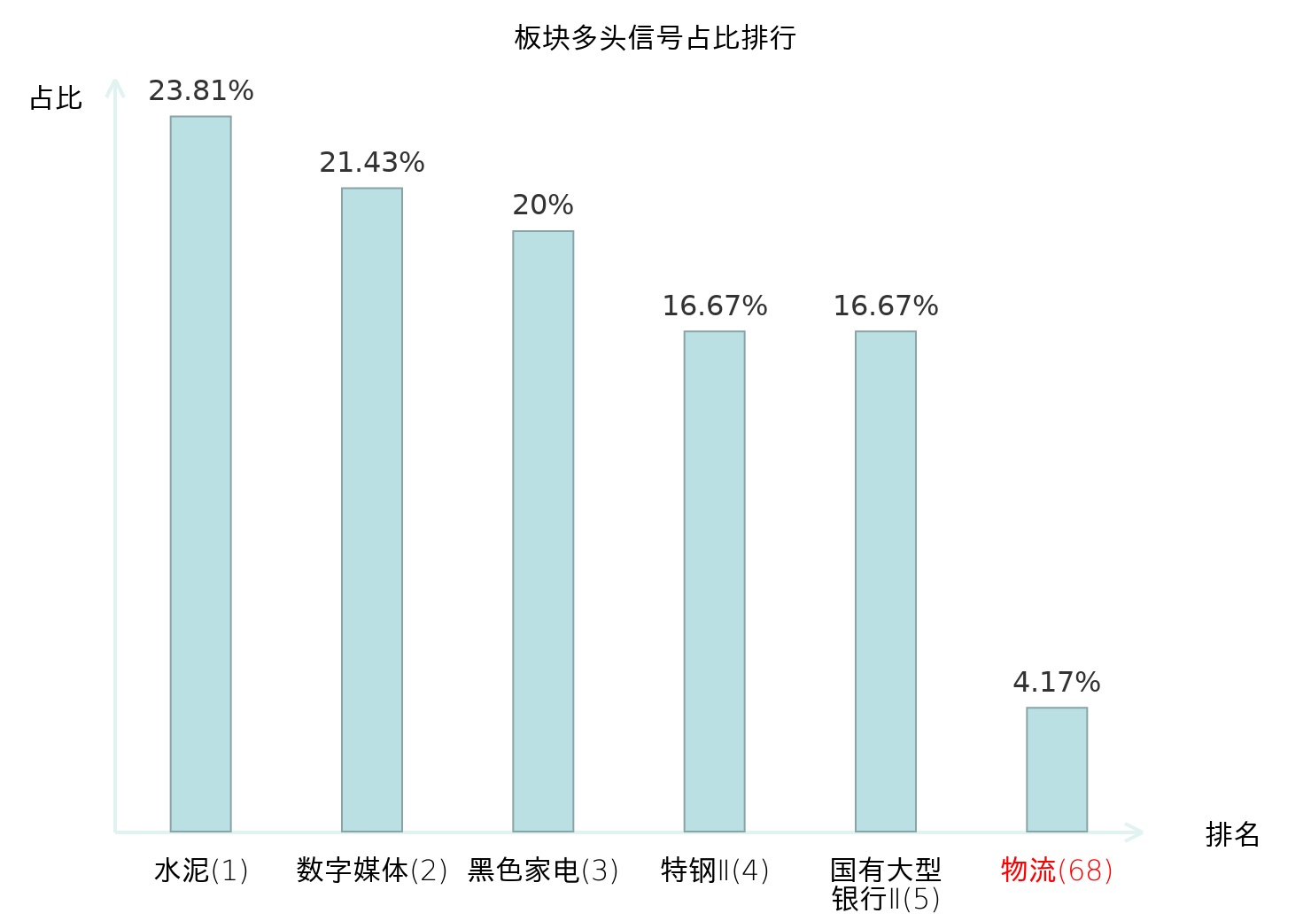 全市场所有行业板块中主力多头信号占比排名中,水泥板块位居第一。焦炭Ⅱ板块名次提升最快,较昨日上升115位。
