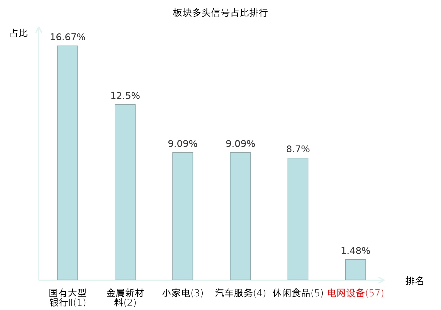 全市场所有行业板块中主力多头信号占比排名中,国有大型银行Ⅱ板块位居第一。汽车服务板块名次提升最快,较昨日上升109位。