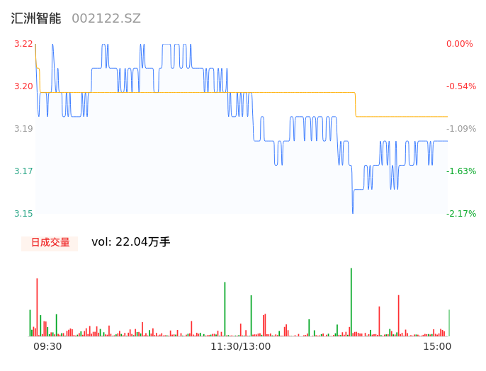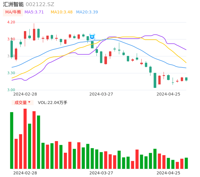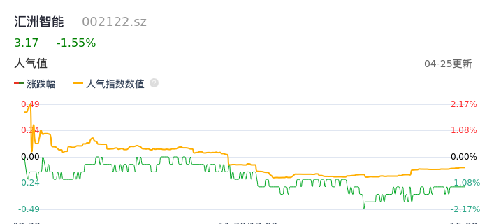 04月25日,汇洲智能收报3.17,股价涨幅-1.55%,成交金额7029.17万元,换手率1.11%。