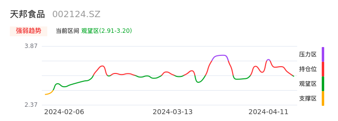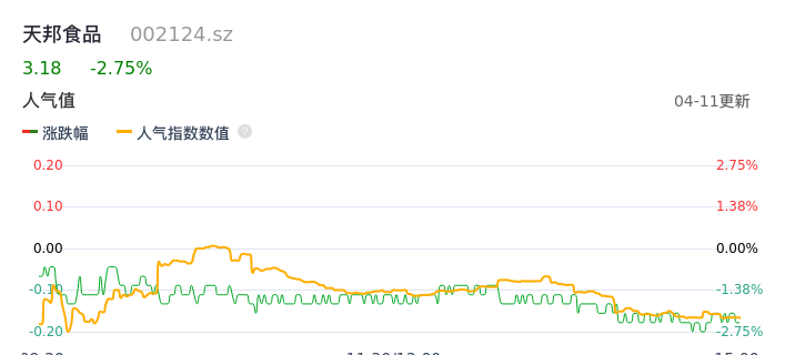 04月11日,天邦食品收报3.18,股价涨幅-2.75%,成交金额2.04亿元,换手率4.07%。