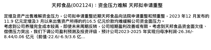 值得注意的是:2024年03月华泰证券的熊承慧分析师,首次发布关于天邦食品的研究报告,标题为:天邦食品(002124):资金压力难解 天邦拟申请重整。