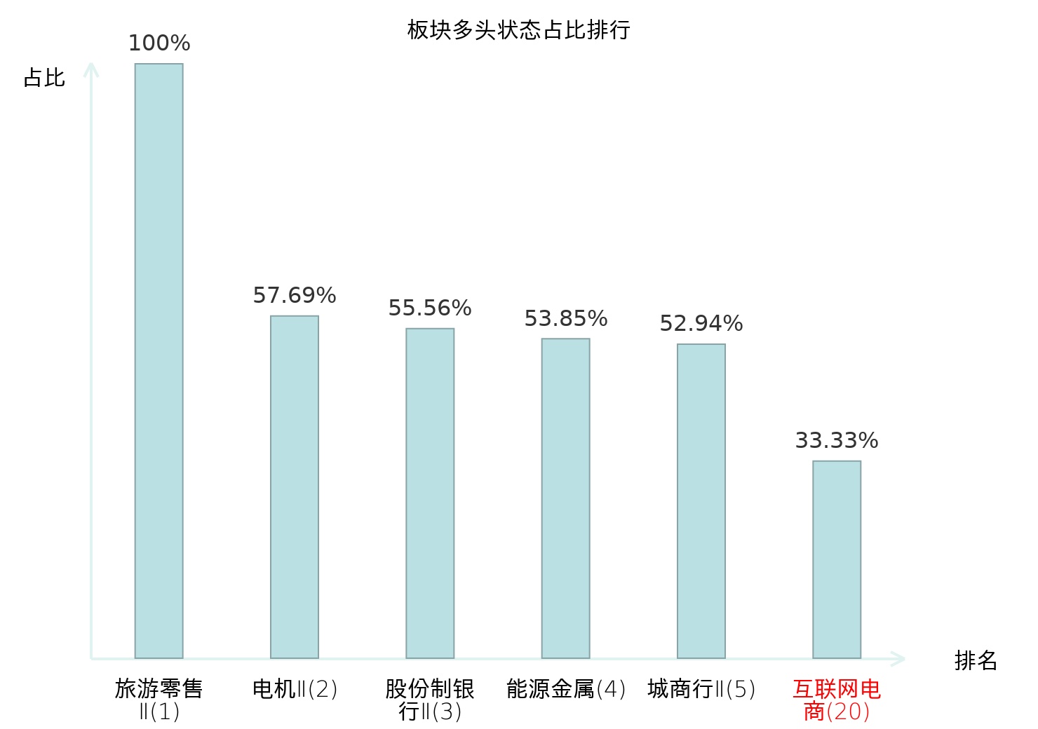 全市场所有行业板块中主力多头状态占比排名中,旅游零售Ⅱ板块位居第一。地面兵装Ⅱ板块名次提升最快,较昨日上升99位。