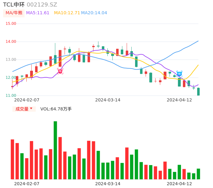 04月12日,TCL中环收报11.01,股价涨幅-3.51%,成交金额7.23亿元,换手率1.60%。