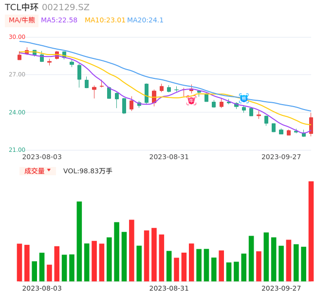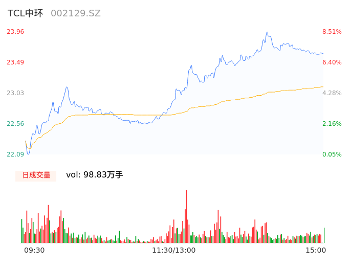 09月27日,TCL中环收报23.58,股价涨幅6.79%,成交金额22.85亿元,换手率2.45%。