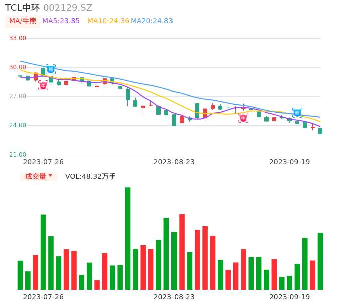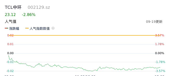 09月19日,TCL中环收报23.12,股价涨幅-2.86%,成交金额11.20亿元,换手率1.20%。