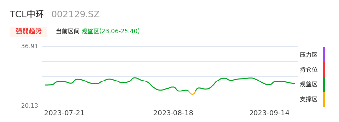 我们来看一下该股的九方特色指标强弱趋势的情况:TCL中环自08月24日从支撑区回到观望区。股价经过前期快速下跌后中途弱势整理。现在下跌动能有重新放大迹象,弱势反弹行情可能临近尾声。建议继续谨慎观望。