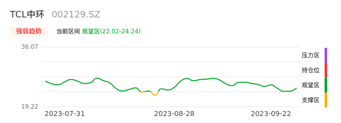 我们来看一下该股的九方特色指标强弱趋势的情况:TCL中环自08月24日从支撑区回到观望区。股价前期快速下跌后经过中途弱势整理。目前短期处于弱势反弹迹象,后续重点关注能否站上多空分界点:24.24元。如未能有效突破则说明弱势反弹行情结束。后续可能再次进入空头行情。