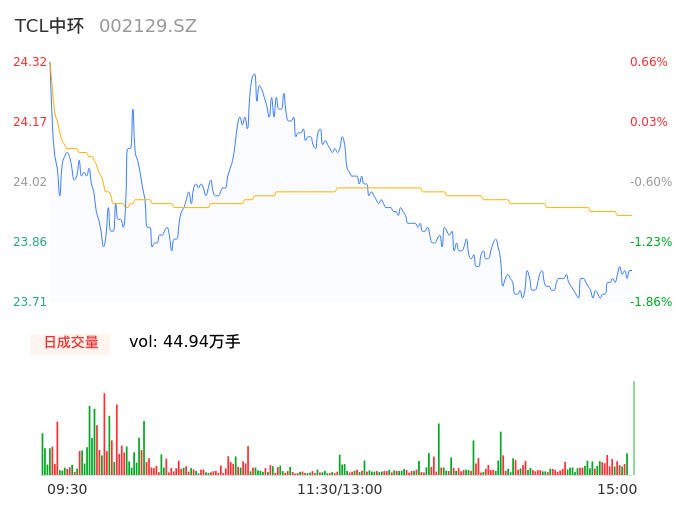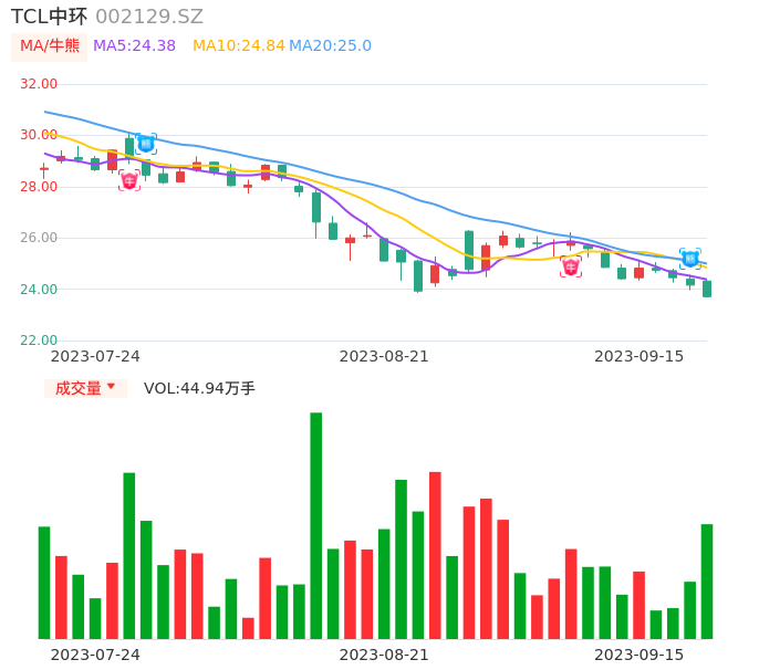 09月15日,TCL中环收报23.71,股价涨幅-1.86%,成交金额10.75亿元,换手率1.11%。