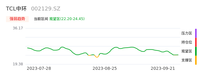 我们来看一下该股的九方特色指标强弱趋势的情况:TCL中环自08月24日从支撑区回到观望区。股价经过前期快速下跌后中途弱势整理。现在下跌动能有重新放大迹象,弱势反弹行情可能临近尾声。建议继续谨慎观望。