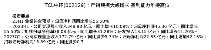 值得注意的是:2023年09月浙商证券的张雷/陈明雨/谢金翰/尹仕昕分析师,首次发布关于TCL中环的研究报告,标题为:TCL中环(002129):产销规模大幅增长 盈利能力维持高位。