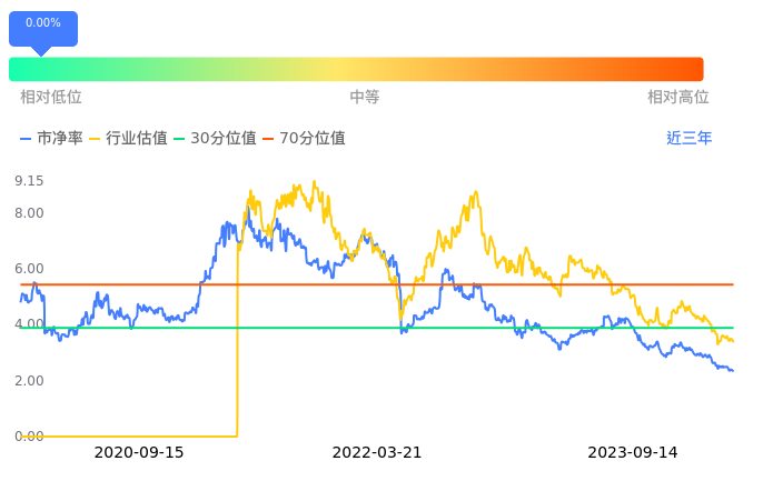 TCL中环当前市净率PB为2.33,在所属的光伏设备中,市净率PB排12,前五名分别为明冠新材市净率1.34、拓日新能市净率1.42、东方日升市净率1.49、亚玛顿市净率1.54、安彩高科市净率1.67。TCL中环当前市净率PB为2.33,超过近3年0.00%的历史数据。