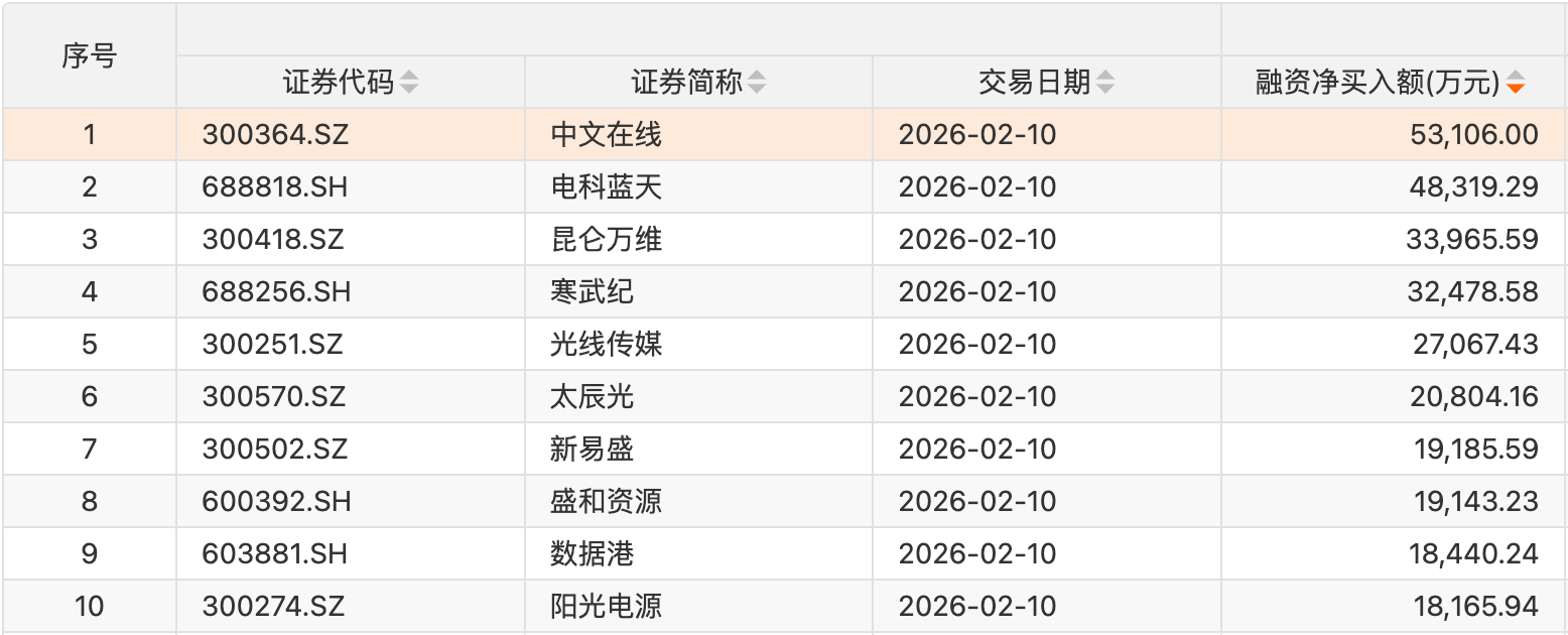 个股方面,26只个股获融资净买入额超1亿元。中文在线获融资净买入额居首,净买入5.31亿元;融资净买入额居前的还有电科蓝天、昆仑万维寒武纪光线传媒太辰光新易盛盛和资源数据港阳光电源