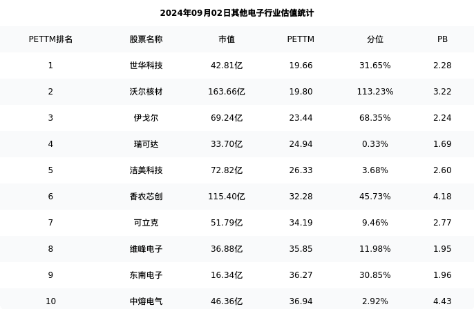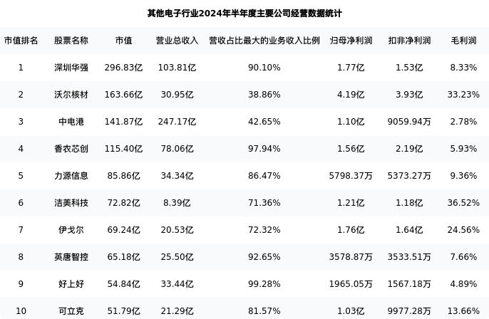 沃尔核材最新报告期数据为半年度,下表汇总了其他电子行业内市值靠前的公司半年度主要经营数据