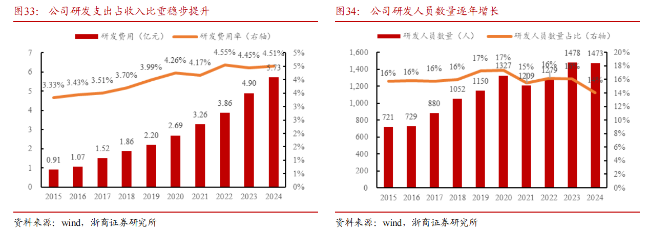 公司研发支出快速增长,占收入比重呈现稳步提升趋势,近年来已保持在4%以上。目前公司在上海、欧洲、北美均设立研发中心,累计有效专利数量1167项,主要覆盖液冷系统、PTC加热器、电池热管理及多通阀等关键技术领域。