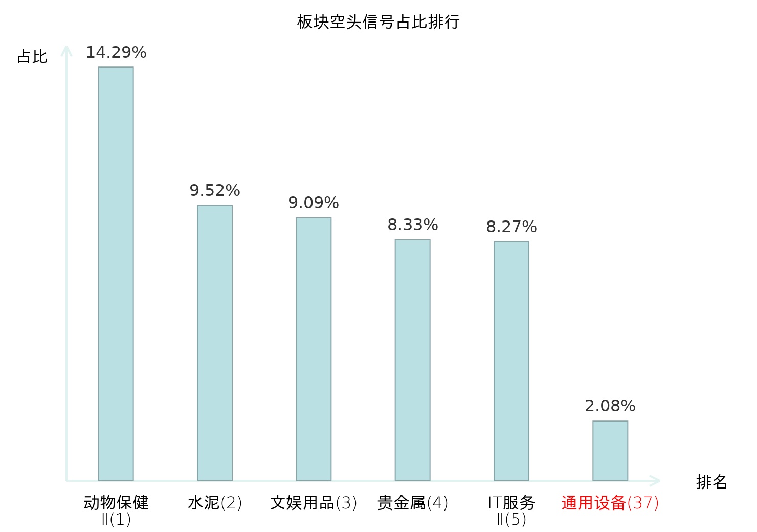 全市场所有行业板块中主力空头信号占比排名中,动物保健Ⅱ板块位居第一。广告营销板块名次提升最快,较昨日上升106位。